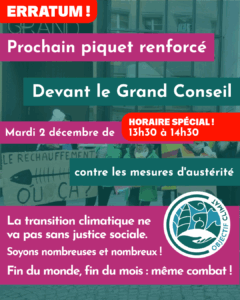 - Acte III, 4 nov., Piquet loi énergiestop à l’obstruction climatique, place au courage politique Piquet renforcé au Grand Conseil : stop à l’obstruction climatique, place au courage politique Ce matin, un piquet renforcé s’est tenu devant le Grand Conseil vaudois pour défendre la future Loi sur l’énergie (LVLEne). L’objectif : montrer que la population attend des actes alignés avec les engagements …