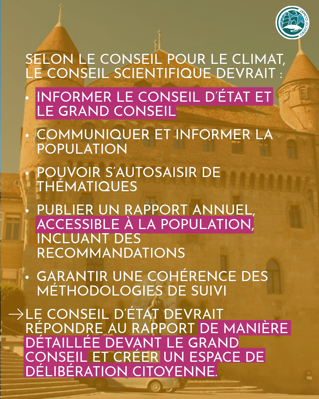 Le conseil scientifique intercantonal, recommandé par le Conseil pour le climat de Genève, est enfin constitué, après plus de deux ans de gestation ! On se réjouit de cette avancée qui renforce les liens entre la science et le politique et permettra, on l’espère fortement, une accélération et un renforcement de la mise en oeuvre de la politique climatique.