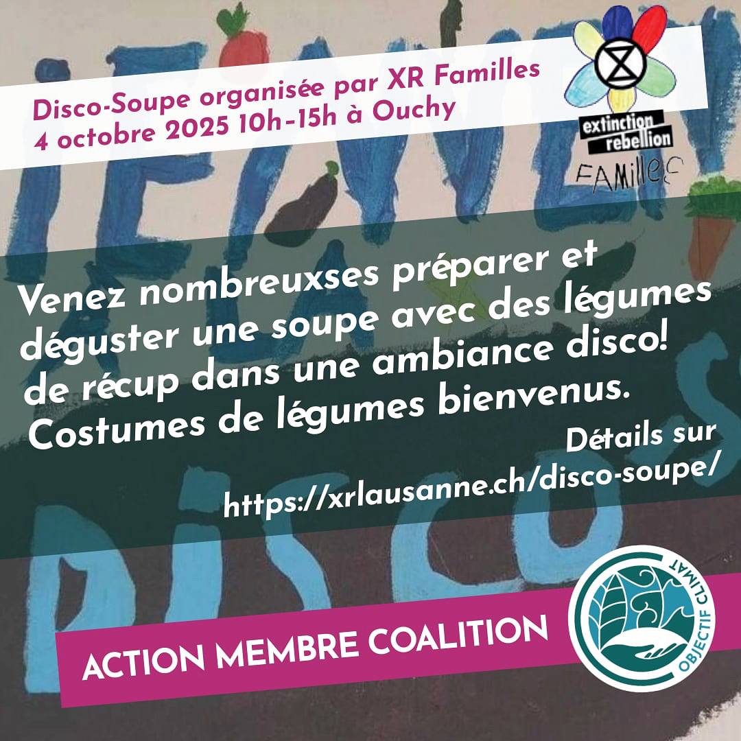 XR FAMILLES 🎉🥕🍲 Disco-soupe – Samedi 4 octobre 2025📍 Ouchy | 🕙 10h – 16h Une journée conviviale, militante et festive autour de la récup alimentaire ✊🌍, de la cuisine …