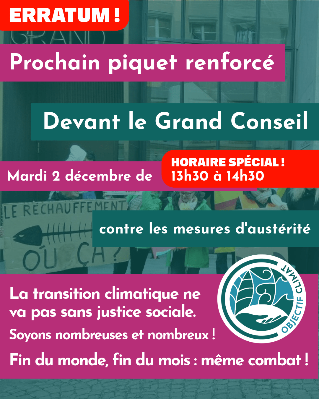📣 PIQUET RENFORCÉ contre les mesures d’austérité 💥 🕗 Mardi 2 décembre, 13h30–14h30📍 Devant le Grand Conseil RDV devant le Grand Conseil car la transition climatique ne va pas sans …