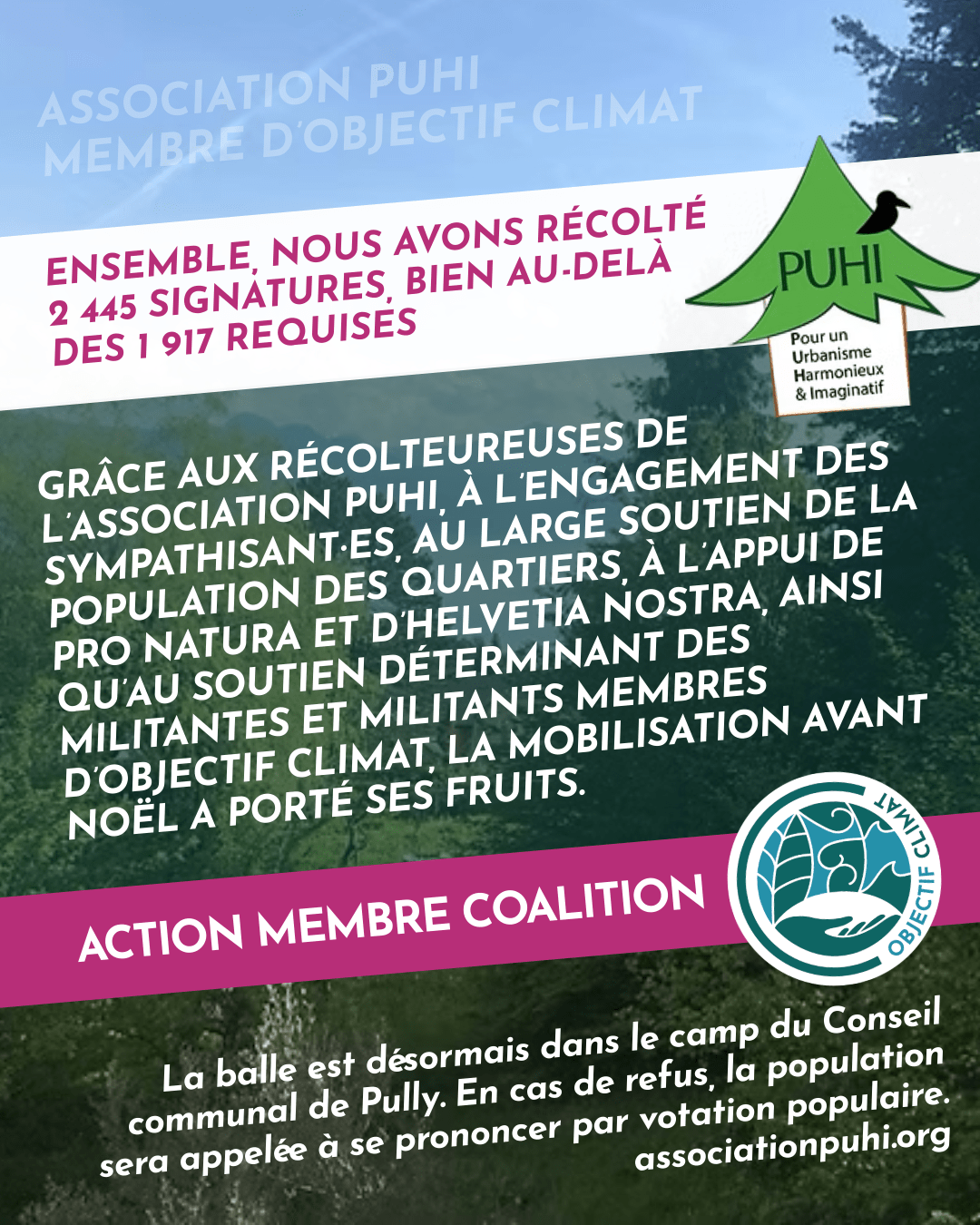 Grâce aux récolteureuses de l’association de PUHI, aux sympathisant.es, à un large soutien de la population au sein des quartiers, de Pro Natura, Helvetia Nostra et au soutien bienvenu des …